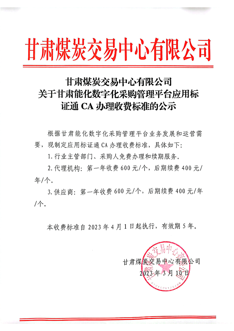 關(guān)于甘肅能化數(shù)字化采購管理平臺應(yīng)用標(biāo)證通CA辦理收費標(biāo)準(zhǔn)的公示